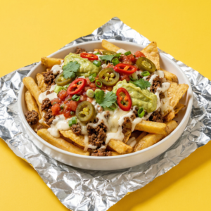 Sour Cream, Doritos, Coriander, Mince Patty, Salsa, Guacamole, Jalepenos, Red Chilli Garnish, Cheese Sauce