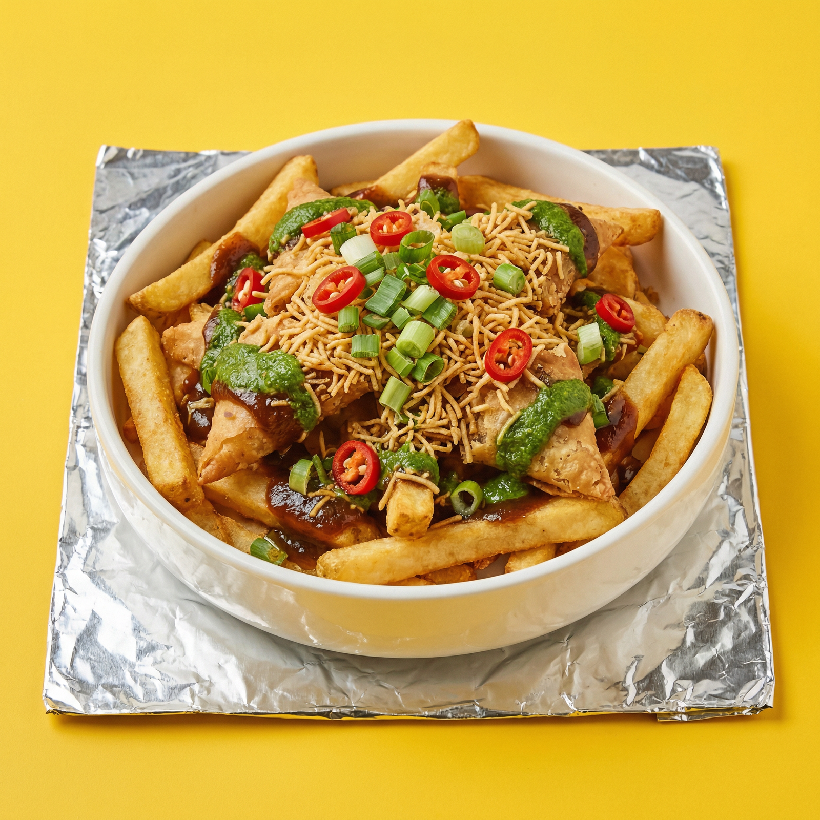 Samosa, Chakpata Sauce, Savian, Mint Sauce, Spring Onions, Red Sliced Chili